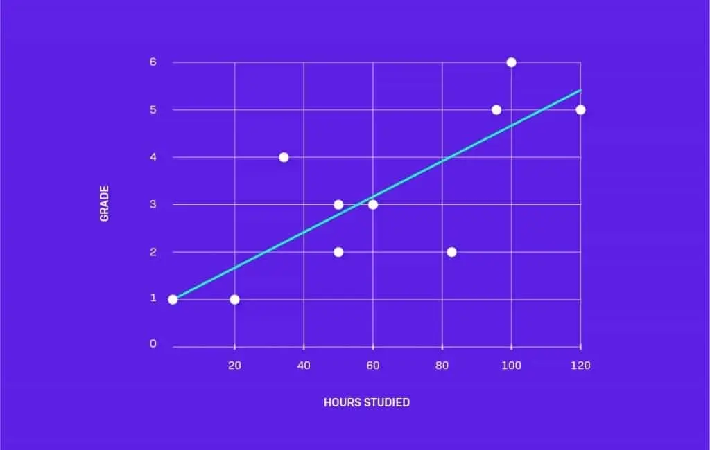 This is where machine learning comes in. The idea is quite simple: feed the computer with lots of data and have it “learn” from it. What does this learning look like? Let’s say that we’ve collected some data about the hours students spent studying and the final grade they got. Let’s draw a plot for this. It could look like this: