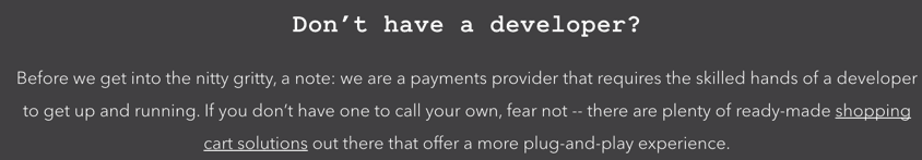 That’s why I was so frigging pumped for Braintree. Braintree is a service made by Paypal, which essentially is a simplified version of its older brother. It is designed for smaller businesses and it’s lean and not as robust as its parent company. But it is still impossible for a non-technical person to understand how Braintree works. A great example of that is: