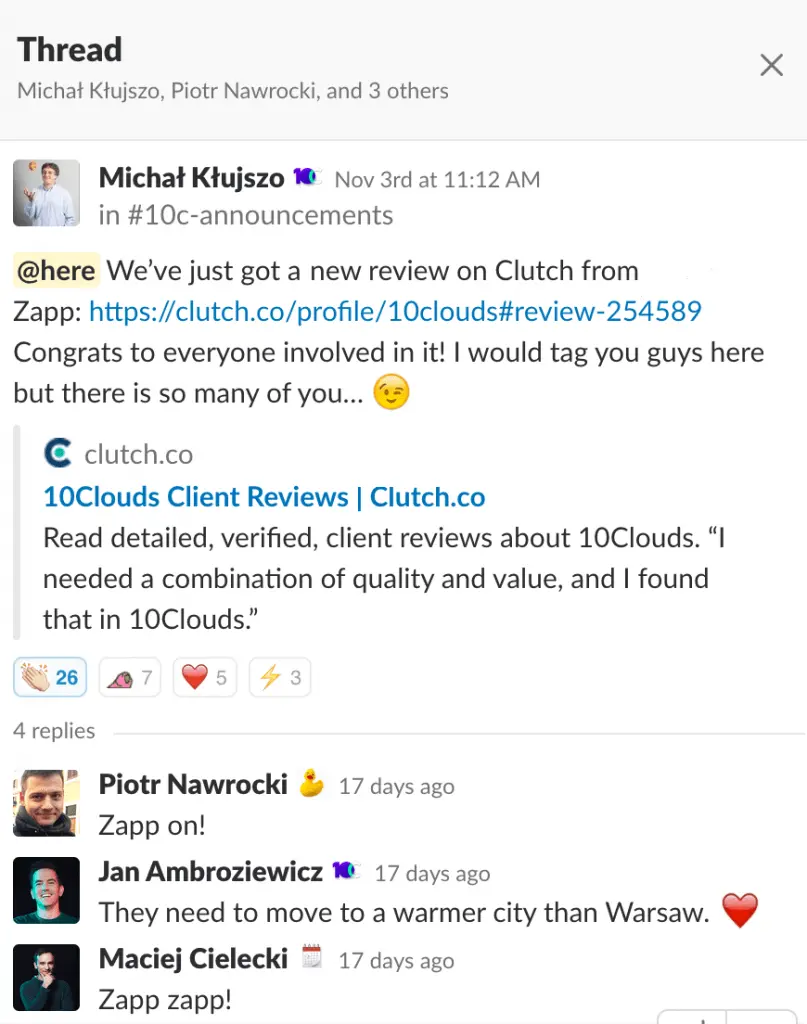 Even with responses in threads and emoji reactions under every important update, the core of company communications is the HOW. After joining 10Clouds, I felt anxious about speaking up on public channels. It posed a challenge as I felt I knew too little, both about the company and its communications style.