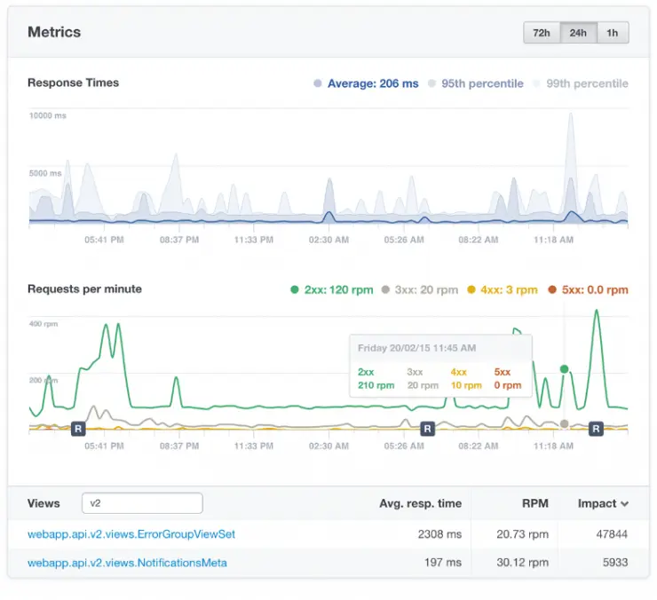 If you are familiar with Sentry, which is another application monitoring solution, the error section of Opbeat is kind of similar – with the notifications, error grouping, resolutions and stack traces (screens of Opbeat are taken from their website).