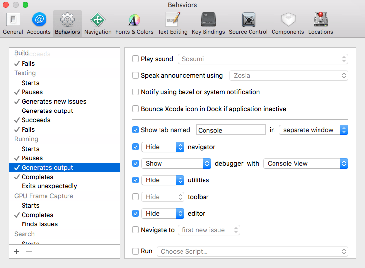 Let’s start from the beginning, shall we? Xcode behaviours allow you to define a set of actions when a specific event occurs. There are practically lots of them (just go to Settings -> Behaviours and you will see the full list), but let me name a few basic ones:
