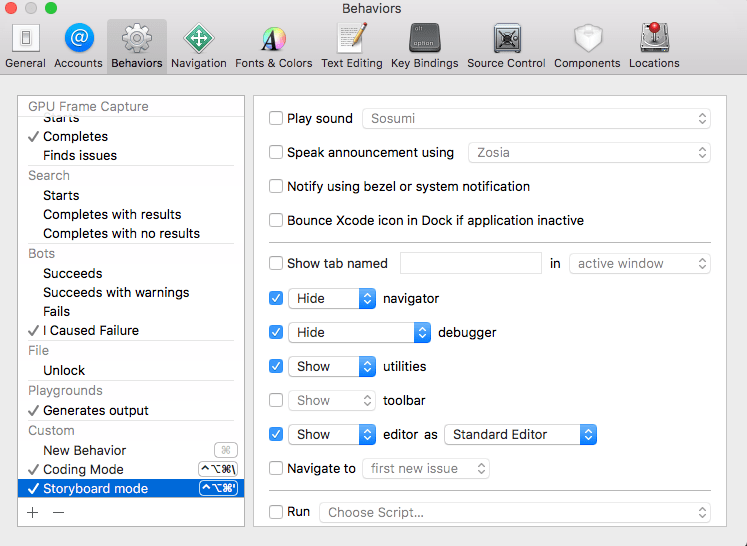 Same as for events, you can set up behaviours with custom key shortcuts. When I work on my project, I usually write code or play with Storyboards. These two modes require different setups. Go to Settings -> Behaviours and choose Custom -> tap + and click the Command icon to assign a friendly shortcut that will trigger your newly setup behaviour.