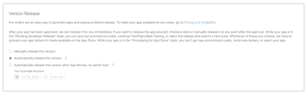 Decide on the method of release: Finally, you’ll be able to decide on the method of your apps release from the three options of manual (from AppStore Connect), immediate (following certification) and On a date (scheduled following certification).