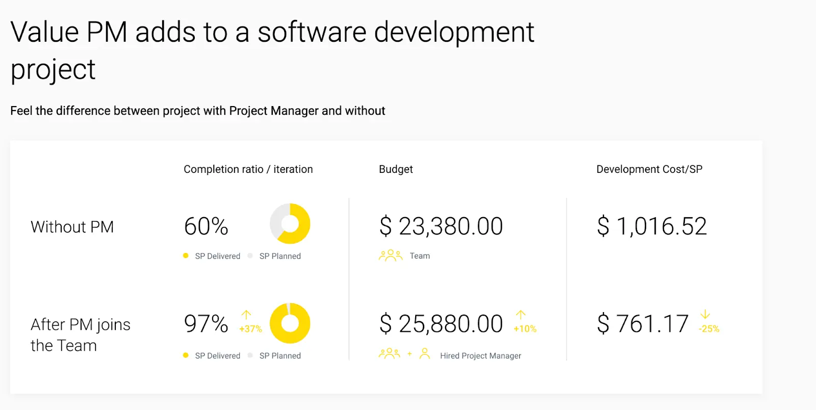 Now, let's return to the scope of benefits we mentioned above. Engaging a Product Delivery Manager means a lower software cost estimation - plus all of the below.
