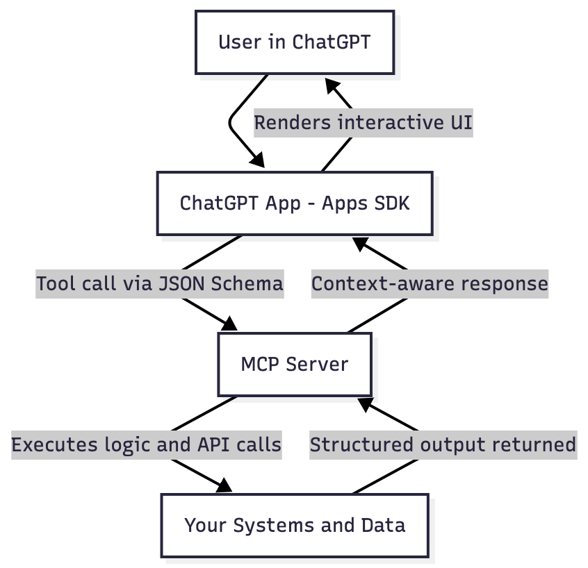 When a user interacts with your ChatGPT app, the model sends structured requests to your MCP server, which executes logic, calls APIs, and returns results as context-aware responses rendered directly in the chat.