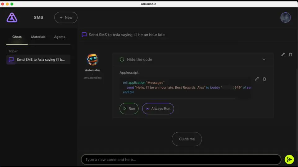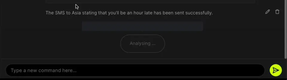4. Now, simply create a new chat and type “Send SMS to Asia saying I'll be an hour late.”