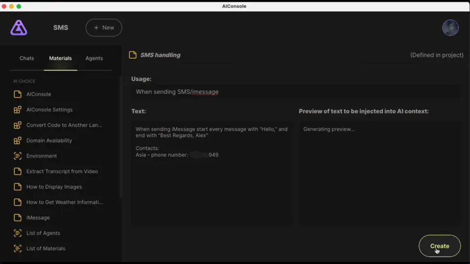 Now, each time our user needs to send an SMS, the AIConsole will remember the instructions.