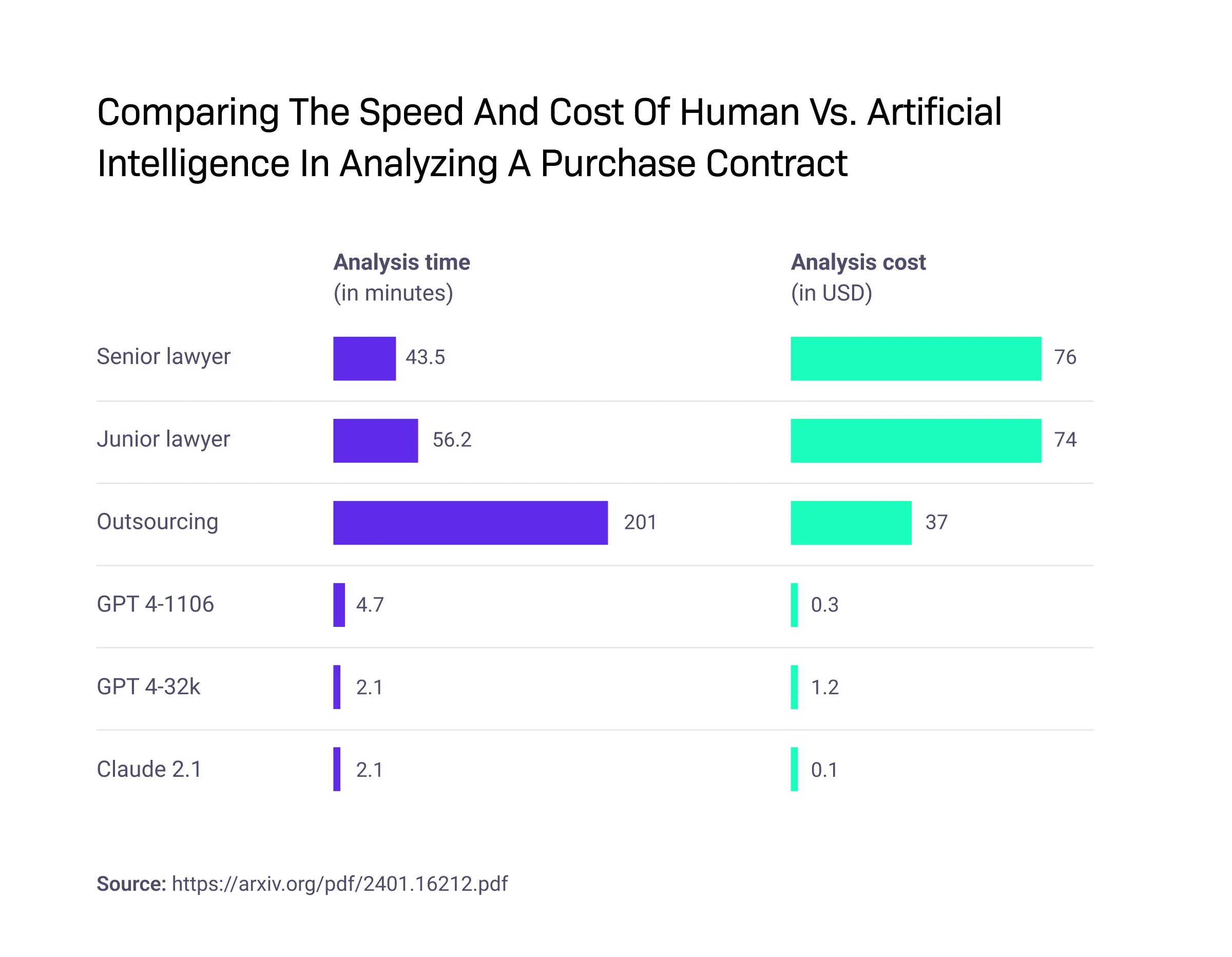 For instance, consider the comparison between AI analyzing specific legal documents and human employees performing the same task.