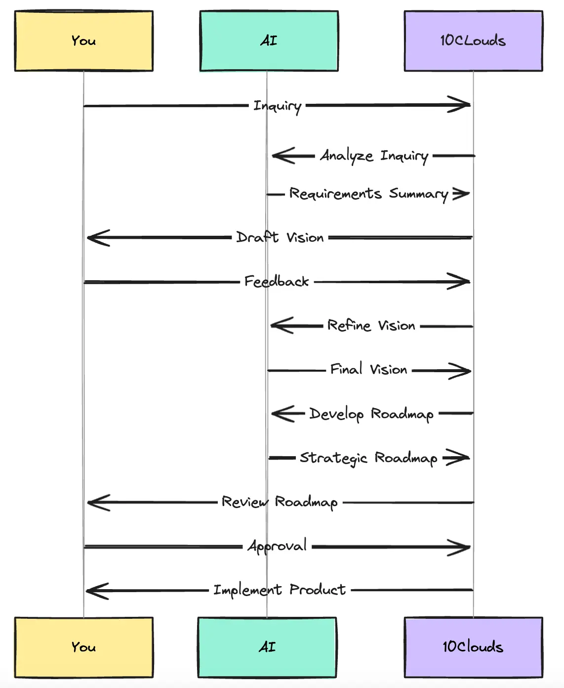 At 10Clouds, we've always been committed to delivering value to our clients at every stage of the product process, and now we're harnessing the power of AI to boost it even further. Here's how we're optimizing our approach just for you: