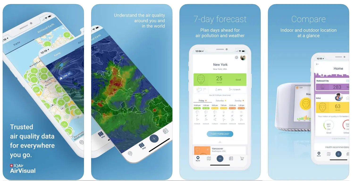AirVisual is a real-time and forecast air quality app that provides AQI indices for over 70 countries worldwide. Available on both Android and iOS, the free app gathers information from more than 9,000 locations via global networks of government monitoring stations and AirVisual's own sensors.