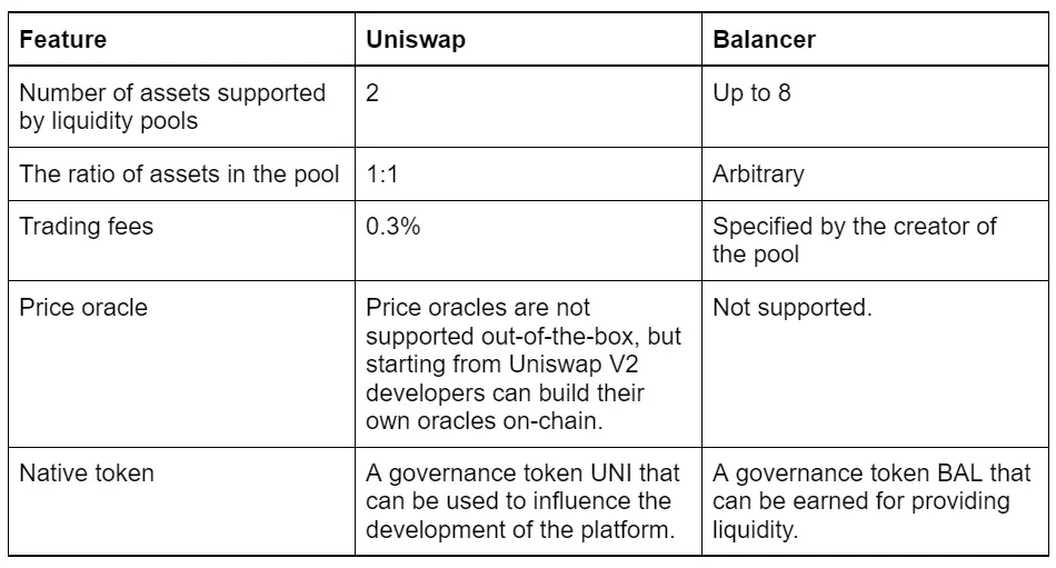 As previously mentioned, Uniswap and Balancer are two of the leading DEXes. But it’s important to note that the Uniswap protocol offers a distinctive, decentralized governance model, while the Balancer protocol allows its user to decide on custom trading fees and provide liquidity for up to eight assets in one liquidity pool.