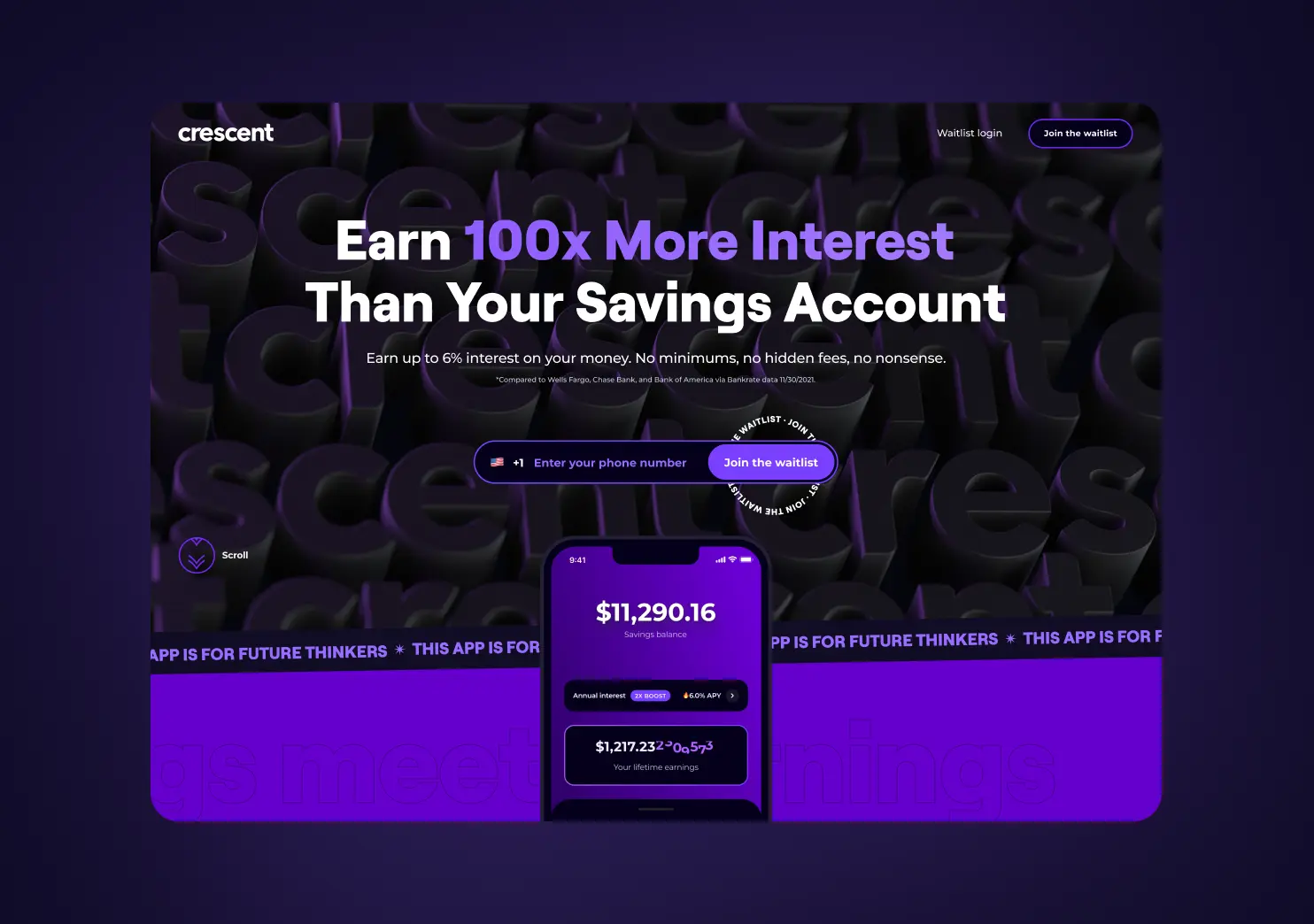 The landing page we designed for Crescent, a blockchain-based finance app, making high-yield interest accessible to all. The branding played a big part in engaging users who were new to crypto.