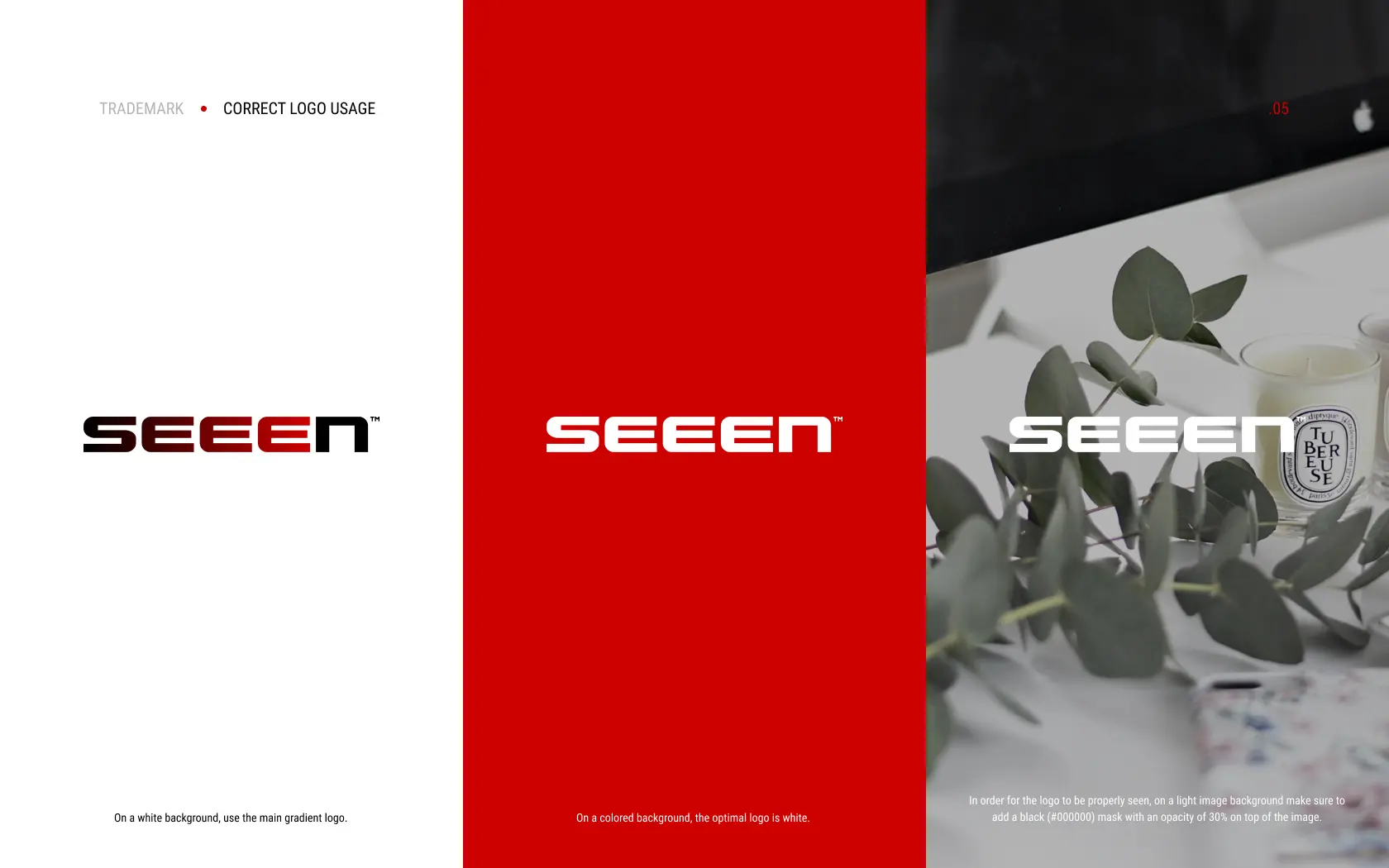 SEEEN previously didn’t have its own defined brand colours, so we set these and explained how these should be used in different contexts and against various backgrounds.