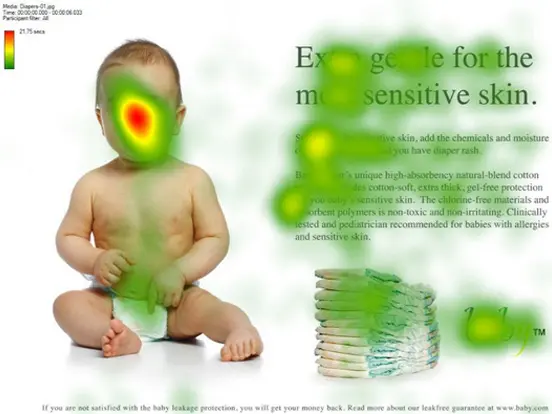For example, when a picture of a person is used on a website, the user’s sight line will automatically follow the gaze direction of the person in the picture. The photo below provides a good example of this rule, with the heat map representing the eye movement of tested users.