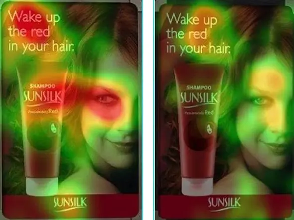 Above, altering the sight direction of the woman in the picture significantly changed the way the ad was viewed. The picture on the left, where the woman is looking directly at the product, shows that there is much more chance that the product and its brand will be visualized and remembered. In the picture on the right, where the woman’s sight is directed straight forward at the user, the brand and the product are almost unnoticed.