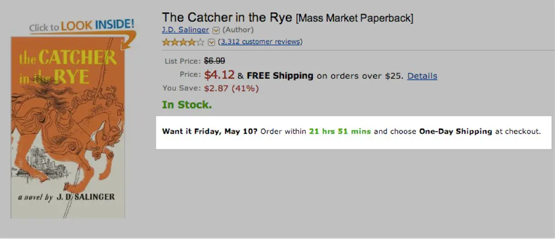 On the subpage for every Amazon product, we clearly see, “Want it Tuesday, Dec. 17? Order within 31 hrs 28 mins and choose One-Day Shipping at checkout.”