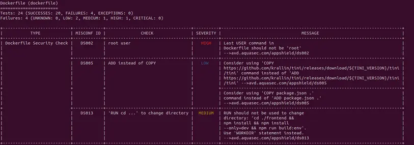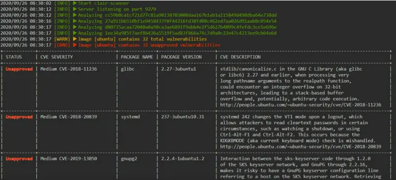 Clair is an open-source container static vulnerability analyzer and the most popular open-source scanning tool. As seen in the comparison above it tops Anchor and has similar results to Trivy. However, it takes a lot of time to run as CLI. Starting Clair from scratch takes about 20 to 30 minutes because the database needs to be filled up with CVEs. Clair needs to access the container layers and therefore you need remote access from Clair to your build job. It’s much more suited to work as a standalone service. I would personally recommend Trivy as it’s easier to use and gives similar results. Nevertheless, that’s a matter of personal preference and choosing Clair should also be considered as a valid option.