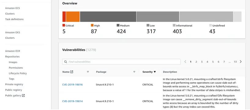 AWS ECR in the background uses Clair in the background. This solves the problems of the tool’s complexity and negates the time-consuming process of updating the database for Clair. We have an option to scan images on the push for $0.09 per scan or scan them actively each time when a new CVEs is released for an additional $0.01 per active scan. The Enhanced scanning allows checking for programing language package vulnerabilities as well. For any project that is already relying on AWS infrastructure, AWS ECR seems like a natural choice. It allows for easy integration with other AWS resources, for example by sending notifications through EventBridge to Slack. For the how-to part, I’ll do my best to send you directly to AWS docs where the whole process is well described. Regarding the effectiveness of the tool since it’s based on Clair we can expect a high amount of detected CVEs.