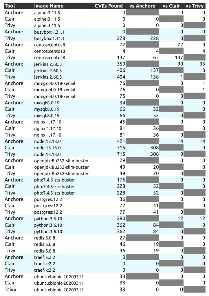 Comparison of CVEs detected Anchore vs Clair vs Trivy Source: a10o.net