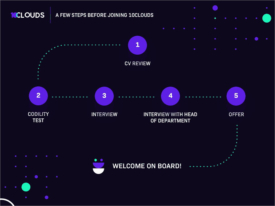 To ensure that you have all the information you need before sending us your CV, we have also prepared this quick step-by-step guide. After reading it, you’ll know exactly how the recruitment process looks like in 10Clouds: