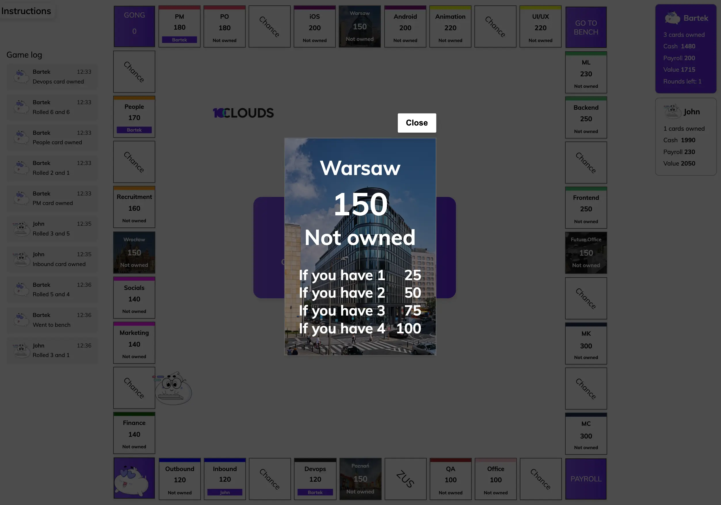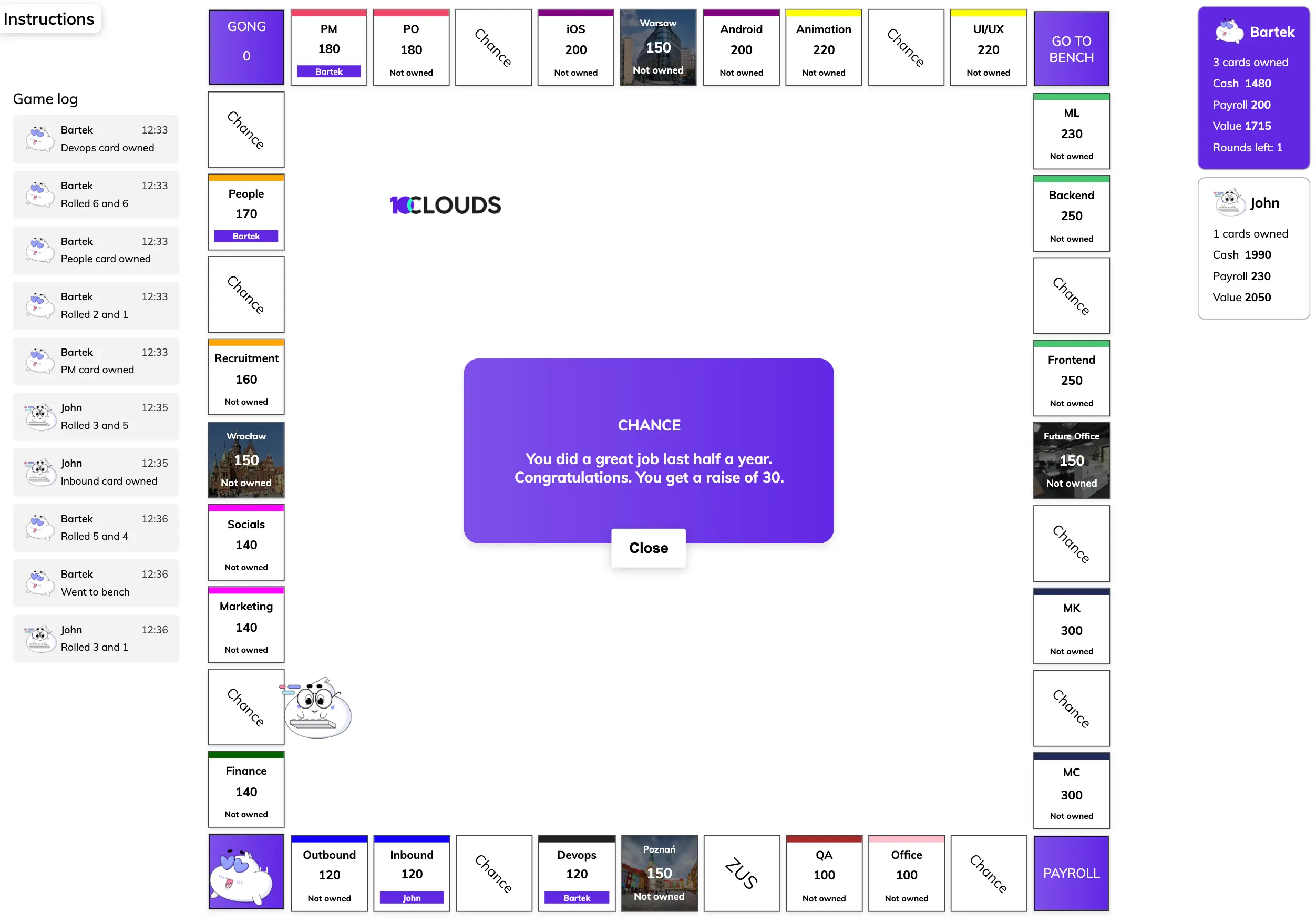Nobody at 10Clouds knew about the project until I came up with the PoC (Proof of Concept) of the game. Only after creating some basic features did I share the idea with a few colleagues on a secret Slack channel. I received great feedback from them and we met a couple of times to discuss the general flow, rules of the game and ideas for further development. We also had a lot of fun creating Chance Cards. During the following weeks, in November and December, we held 3 test sessions which discovered bugs and were very effective in terms of conclusions for new features, backlog refinement and what should be done next.