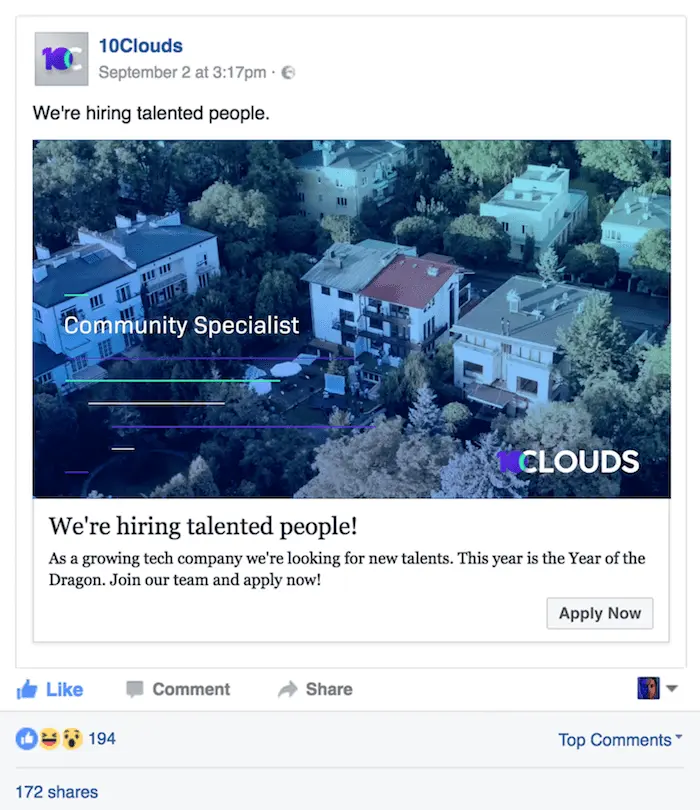 Our plan was to deliver a boosted up versions of recruitment ads we post on Facebook. Until then we usually had one pre-designed still image template, which was later posted to ads and fed with links via Open Graph. This time we decided we wanted video. Everybody expects videos and 10Clouds shouldn’t be any different.