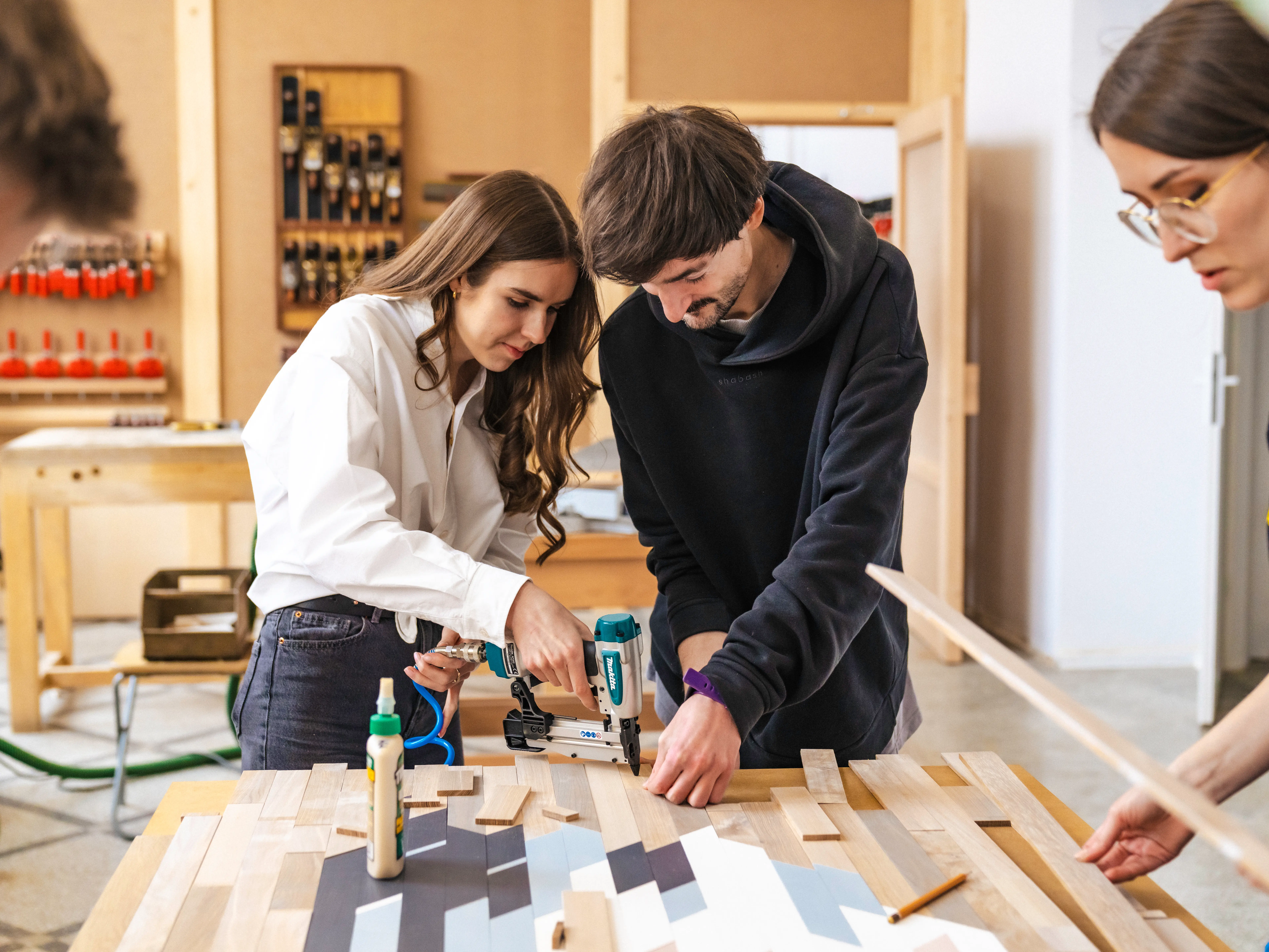 The whole design team got together for an 8-hour workshop and, with the help of a charismatic instructor, learnt how to shape wood elements, dye them and combine them to create a piece of art. There was an array of professional carpentry tools at their disposal, with many colors of paint and different types of wood to work with.