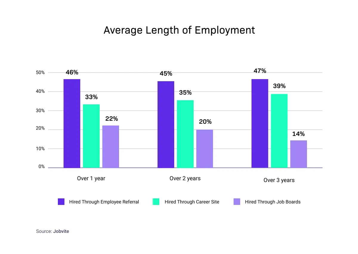 A study conducted by Applicant Tracking System Icims has found that referred employees are likely to stay in a job much longer than those hired used job boards and recruiters. In fact, referred employees stayed with a job for at least 38 months in contrast with non-referred employees who only stayed for an average of 22 months. This is a significant difference of about 70%.