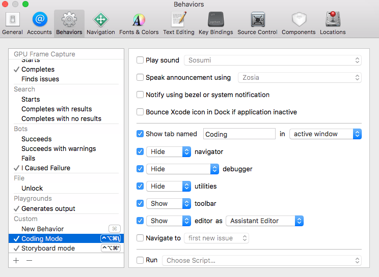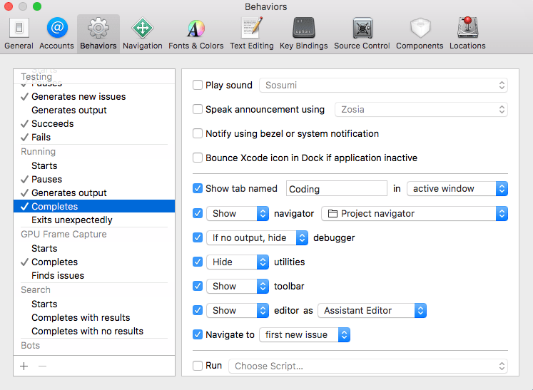 That’s your final custom tab. I would like it to be designed to let me focus on coding. And all I need for coding is an editor. In my case, the Assistant Editor. Go to Settings -> Behaviors and choose Running -> Completes.