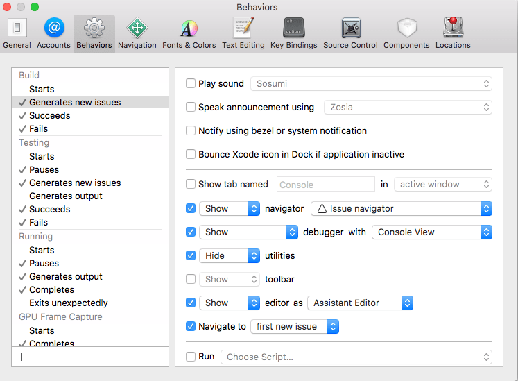 Let’s start from the beginning, shall we? Xcode behaviours allow you to define a set of actions when a specific event occurs. There are practically lots of them (just go to Settings -> Behaviours and you will see the full list), but let me name a few basic ones: