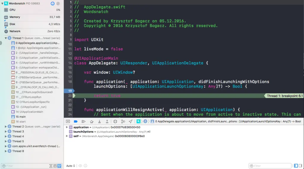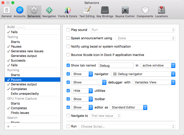 Ok, now that you’ve got your Console covered, let’s prepare custom behaviours for the Debugging mode when your app pauses on a breakpoint or error. In such a case, I would like to see the Debug navigator, a debugger with variables (as I already have a window with a console), and, of course, a tab with the code and breakpoints. This time we will play with “Debug” tab and Running -> Pauses behaviours