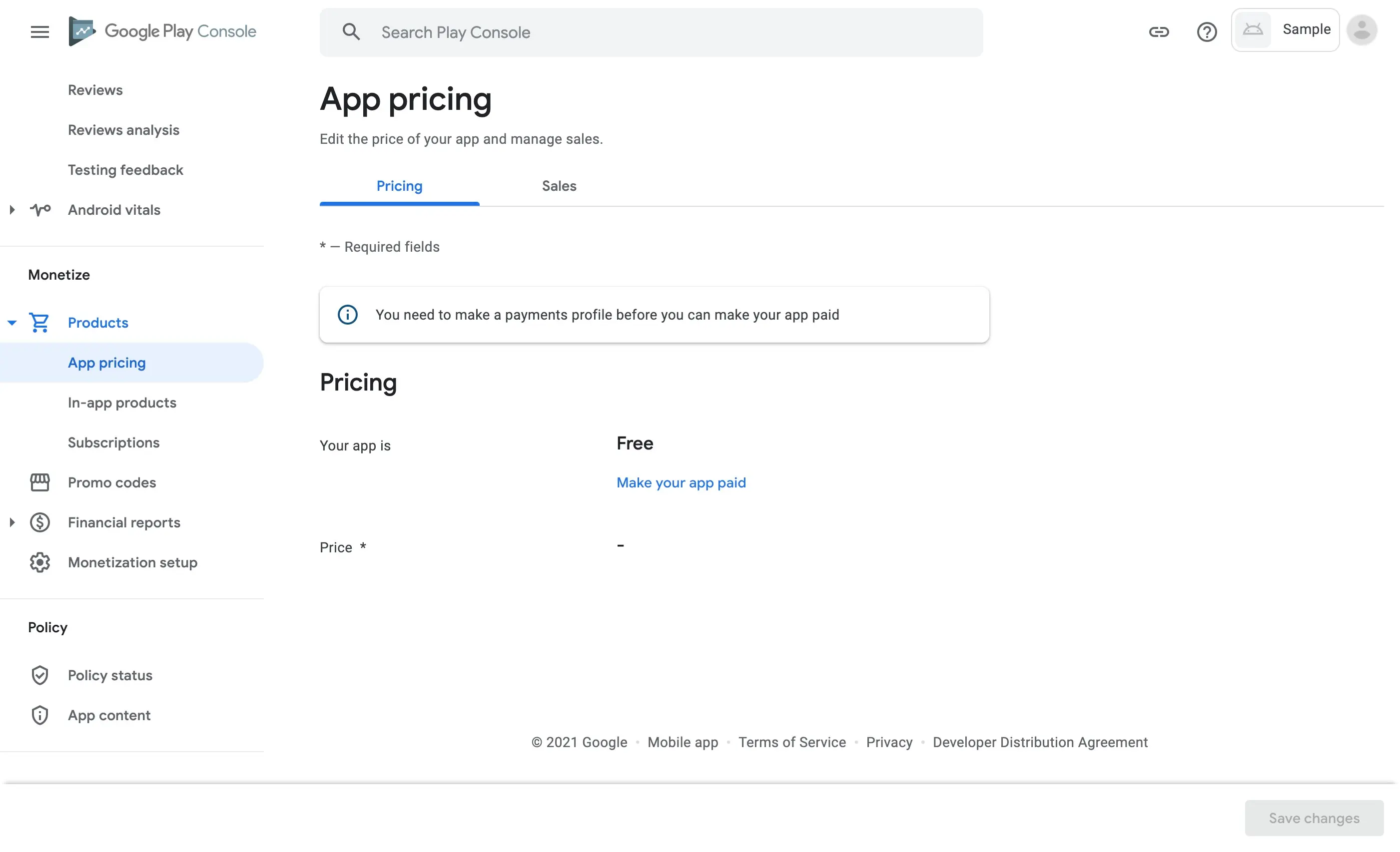 On the Pricing tab, you’ll be asked to choose whether your app is free or paid. You’ll also be able to select a pricing template and to set the price.