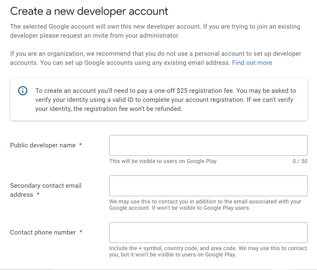 Registering a Google Developer account is essential when it comes to publishing your app. You can sign up specifically for a Google Developer account, or you can use any of your existing Google accounts. Note that you’ll be asked to sign the Google Play Developer distribution agreement, fill in some basic details and pay the registration fee ($25). It’s all a straightforward process. You’ll have to be at least 18 years old to set up an account.