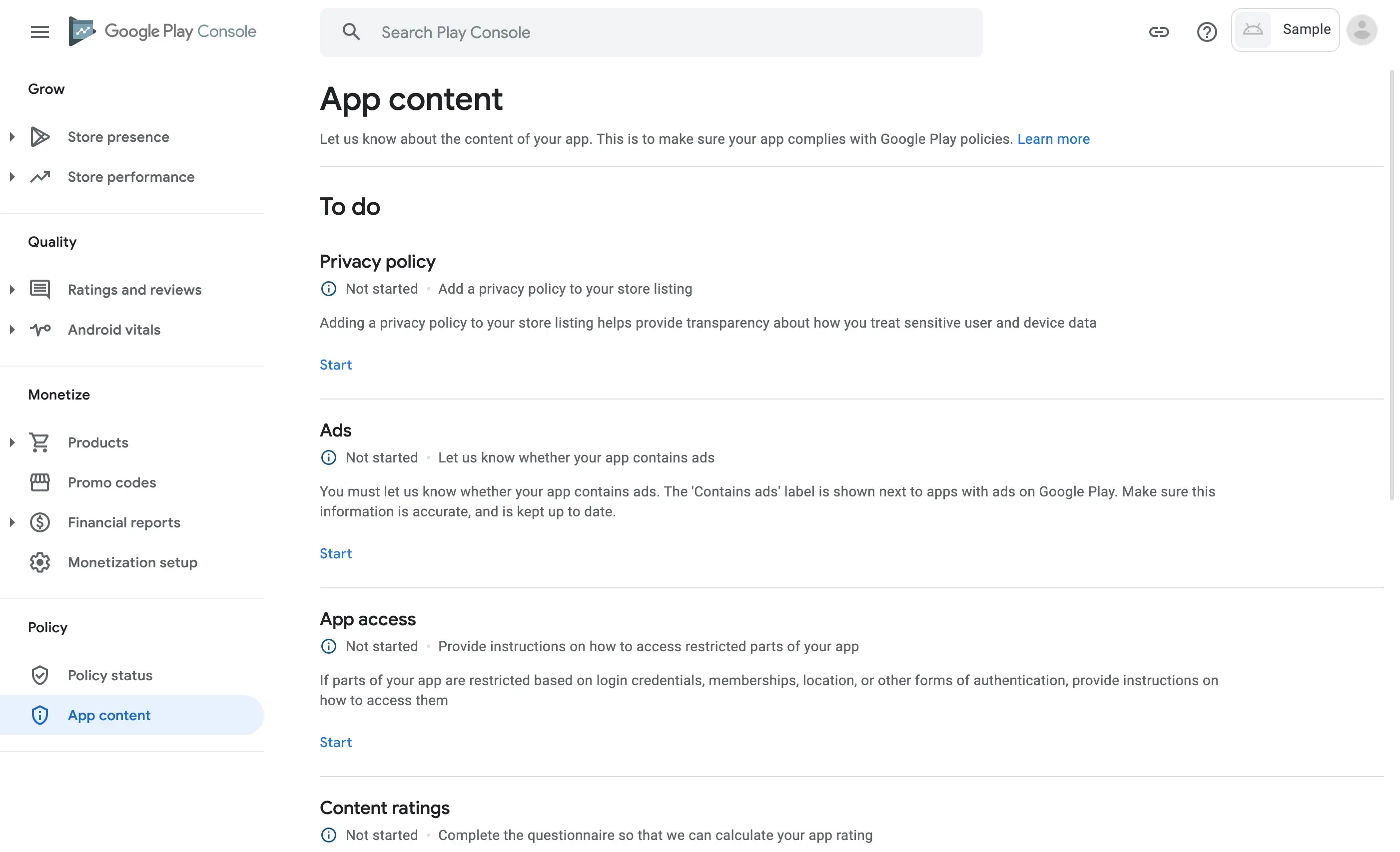 In the Policy tab under app content, you’ll be asked to answer six questions to make sure that your app complies with Google Play policies. These are: