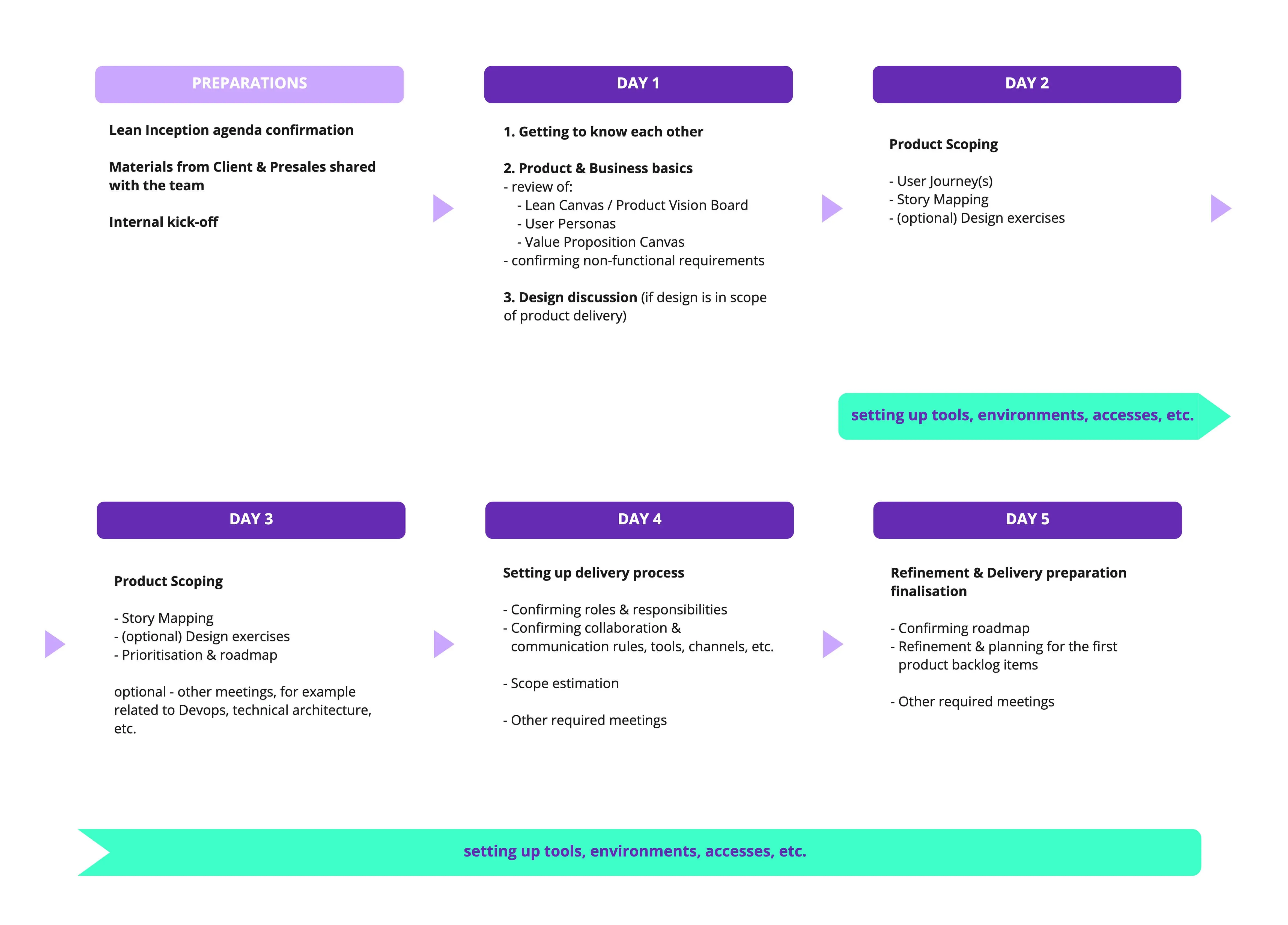 - The team has time to prepare everything needed to start working on the product delivery during the Lean Inception week - it means less idling time related to waiting for access or environments when actual development should start.