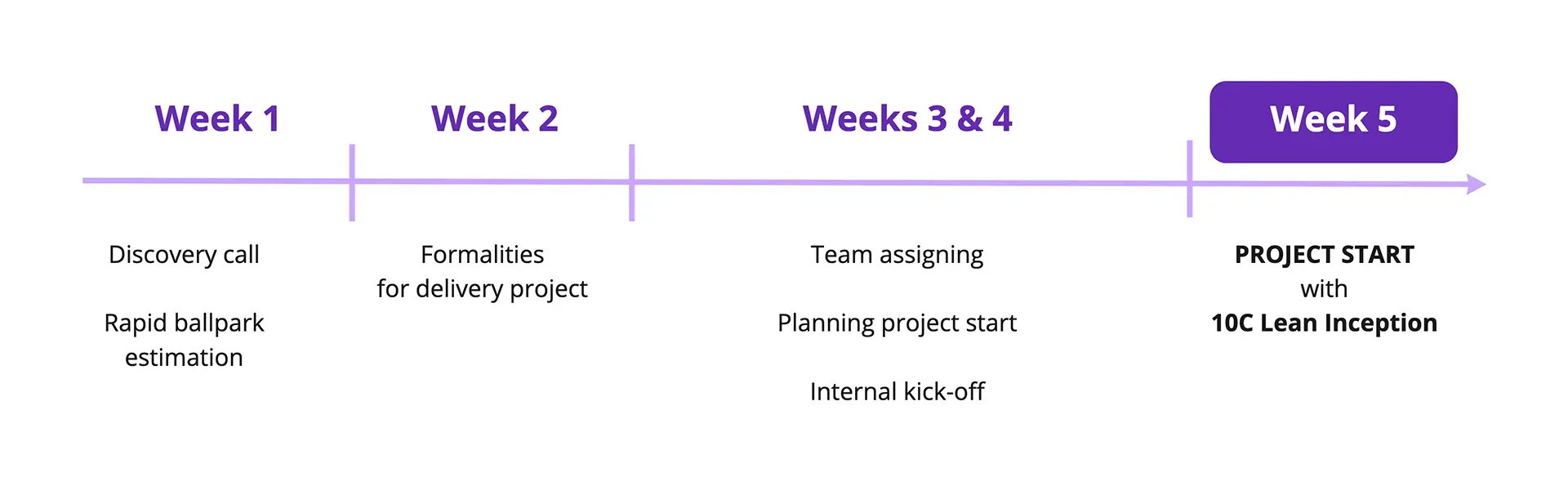 As you can see, we’re able to start the project much quicker - and even a couple of weeks can make a significant difference in modern dynamic markets. It is quite realistic that in week 5, and in simpler cases maybe even after three weeks, you will sit down with your team to work on the Lean Inception and begin the project.