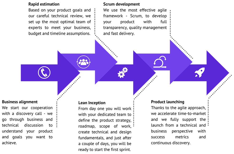From day one you will work with your dedicated team to define the product strategy, roadmap, scope of work, create technical and design fundamentals and just after a couple of days you will be ready to start the first sprint with people fully onboarded and aligned with your business goals.