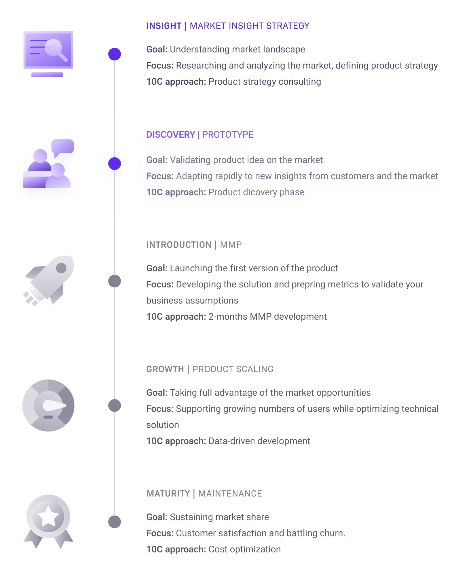 At 10Clouds, the delivery process covers both the Insight and Discovery phases of the product lifecycle, which covers 5 phases in total: