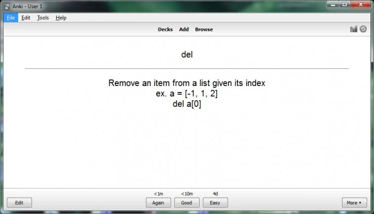 You’re about to say: “Oh gosh! How am I supposed to follow the schedule from above in reality? It’s too complicated”. Do not be scared because there are good solutions! For instance the modest but powerful and efficient app Anki, written with Python. It is available for many platforms including a web version.