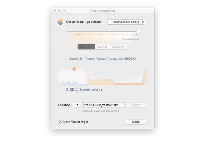 Sore eyes is a symptom associated with eye strain, which is often related to not having the screen’s brightness (which you can resolve with a simple cmd + f1), or color temperature configured properly. f.lux solves these issues because it adjusts your screen’s color temperature based on the time of day. Once you’ve configured flux properly, you won’t even recognize it’s working. However, as an experiment, you can try switching off f.lux late in the day, you will definitely notice the difference when the screen goes back to it’s default colors.