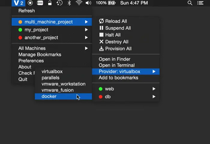 It sits in the task bar and enables you to manage your local vagrants with a menu which contains simple and basic commands.