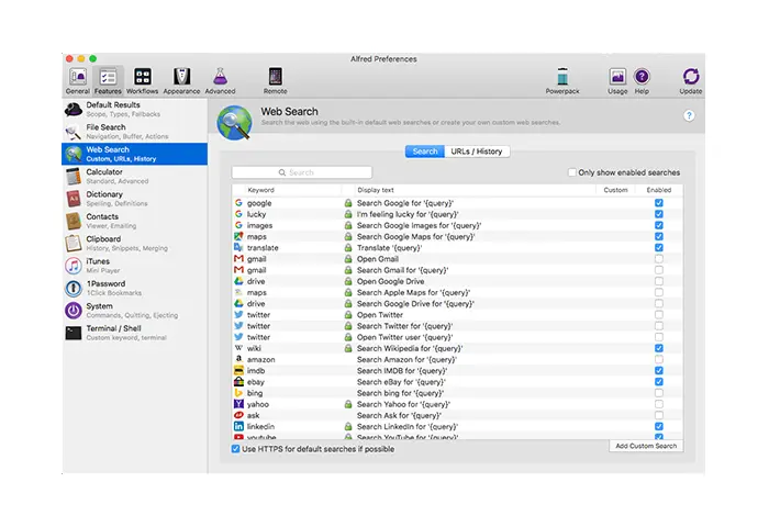After these actions Alfred will automatically open a new tab in chrome and search selected pages with the given phrase. Alfred has many build-in lookups, which you can disable, change or add to yourself own.