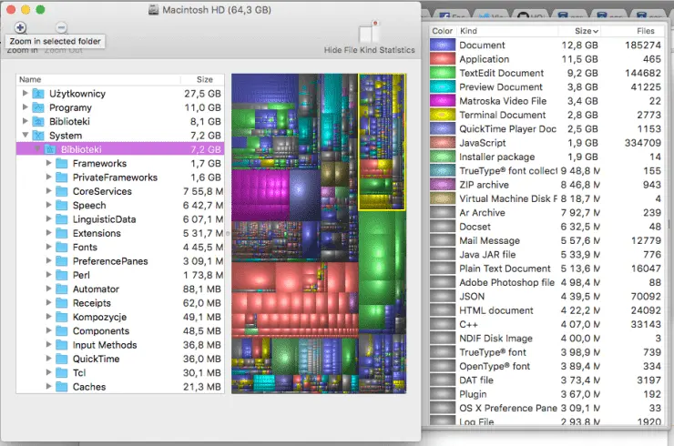 When running out of space on your disk, this application will let you find and remove unnecessary files and folders by presenting some nicely nested disk usage statistics.