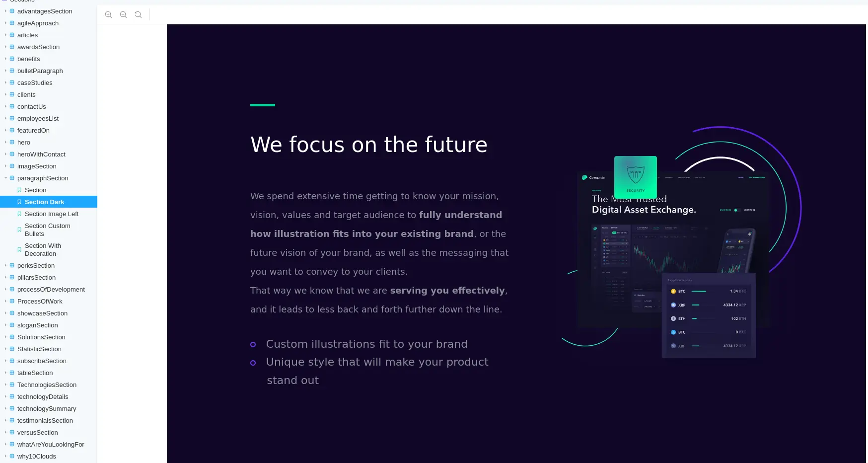 Even if sections have sensible names it's not obvious what they represent. Also how do you plan and visualize new pages? Trying to create page without any other reference than already existing pages is not comfortable nor fast. Thankfully storybook helped us here by allowing us to create gallery of available sections and their variants.